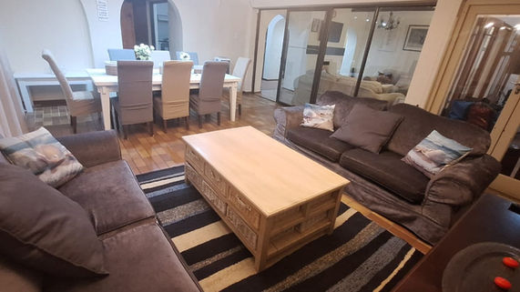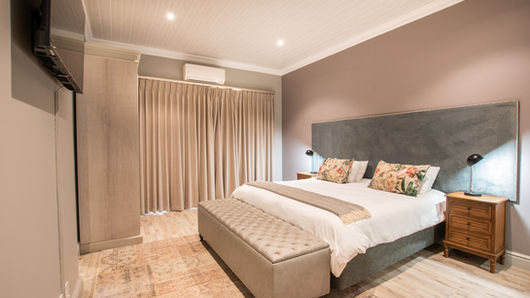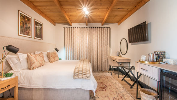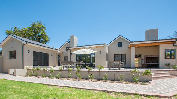 The Château is a spacious and elegant four-bedroom guest villa that is fully equipped with en-suite bathrooms, an open plan kitchen, and a stylish dining room. The large yet inviting lounge is complete with a cosy fireplace, making it the perfect place to unwind during the winter months. Guests can also enjoy the patio area, which features an undercover braai and a Jacuzzi, providing a delightful experience throughout all seasons. fridge, microwave, oven and stove.The Château’s rooms are fully air-conditioned and decorated with a tasteful blend of soft, neutral tones and playful spots of colour and texture in the fabrics. Our guests can expect to find all the luxurious amenities that one would expect from a high-end accommodation experience.